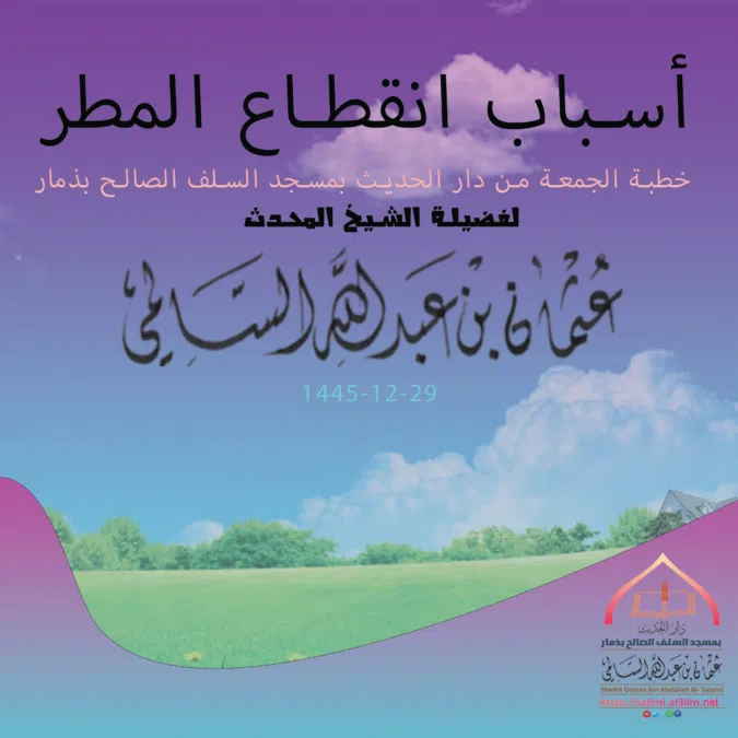 أسباب انقطاع المطر كتبها مصطفى الراشد الجمعة ۲۹ ذو الحجة ۱٤٤۵ هـ الموافق ۵ يوليو ۲۰۲٤ مـ | الخطب | أسباب انقطاع المطر خطبة لفضيلة الشيخ المحدث أبي عبد الله عثمان بن عبد الله السالمي حفظه الله ورعاه ألقيت في دار الحديث بمسجد السلف الصالح بمدينة ذمار حرسها الله بتاريخ 29 /12/ 1445هـ PlayStop نافذة X مرتبط لا تكتمل فرحة المسلمين بعيدهم إلا بنصرة غزة محاسبة النفس اليوم تيسر حساب غد الجدبالقحطالمطرالهلاكانقطاع المطر
